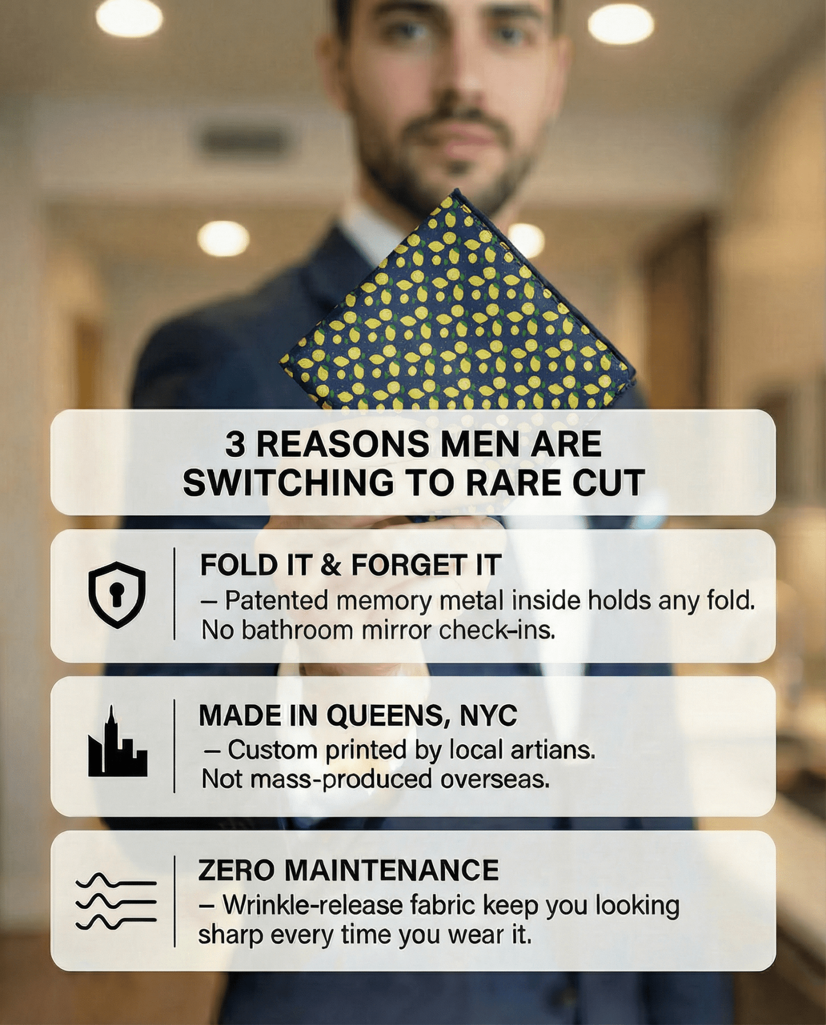 Traditional pocket squares rely on luck to stay in place. RARE CUT uses a proprietary, paper-thin memory-metal lining that allows you to shape your square once and forget about it. It’s the first major innovation in men’s formalwear in a century—designed to keep you looking sharp from the first toast to the final dance.