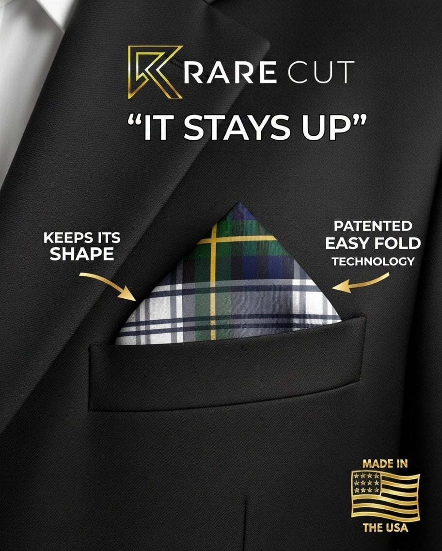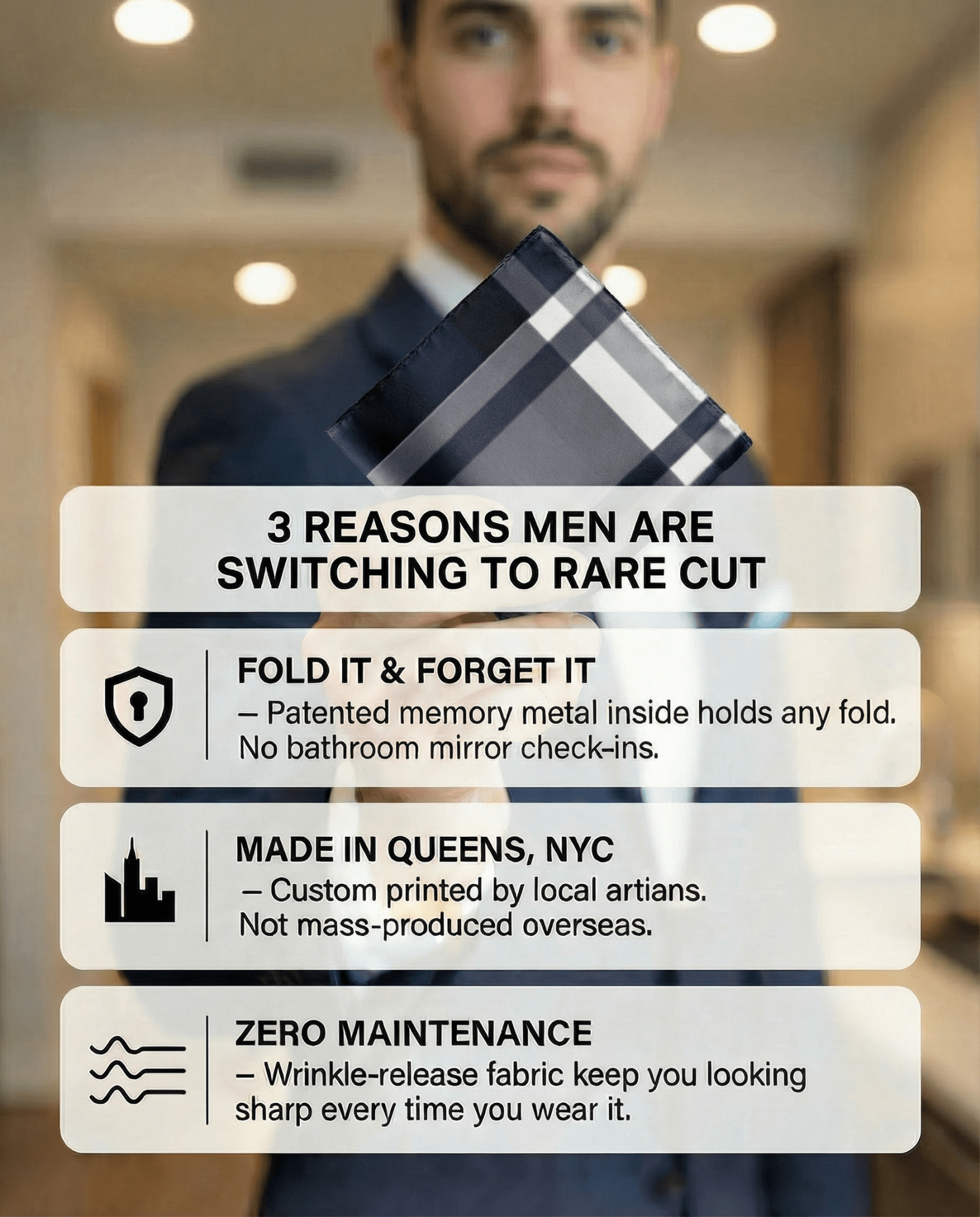 Traditional pocket squares rely on luck to stay in place. RARE CUT uses a proprietary, paper-thin memory-metal lining that allows you to shape your square once and forget about it. It’s the first major innovation in men’s formalwear in a century—designed to keep you looking sharp from the first toast to the final dance.