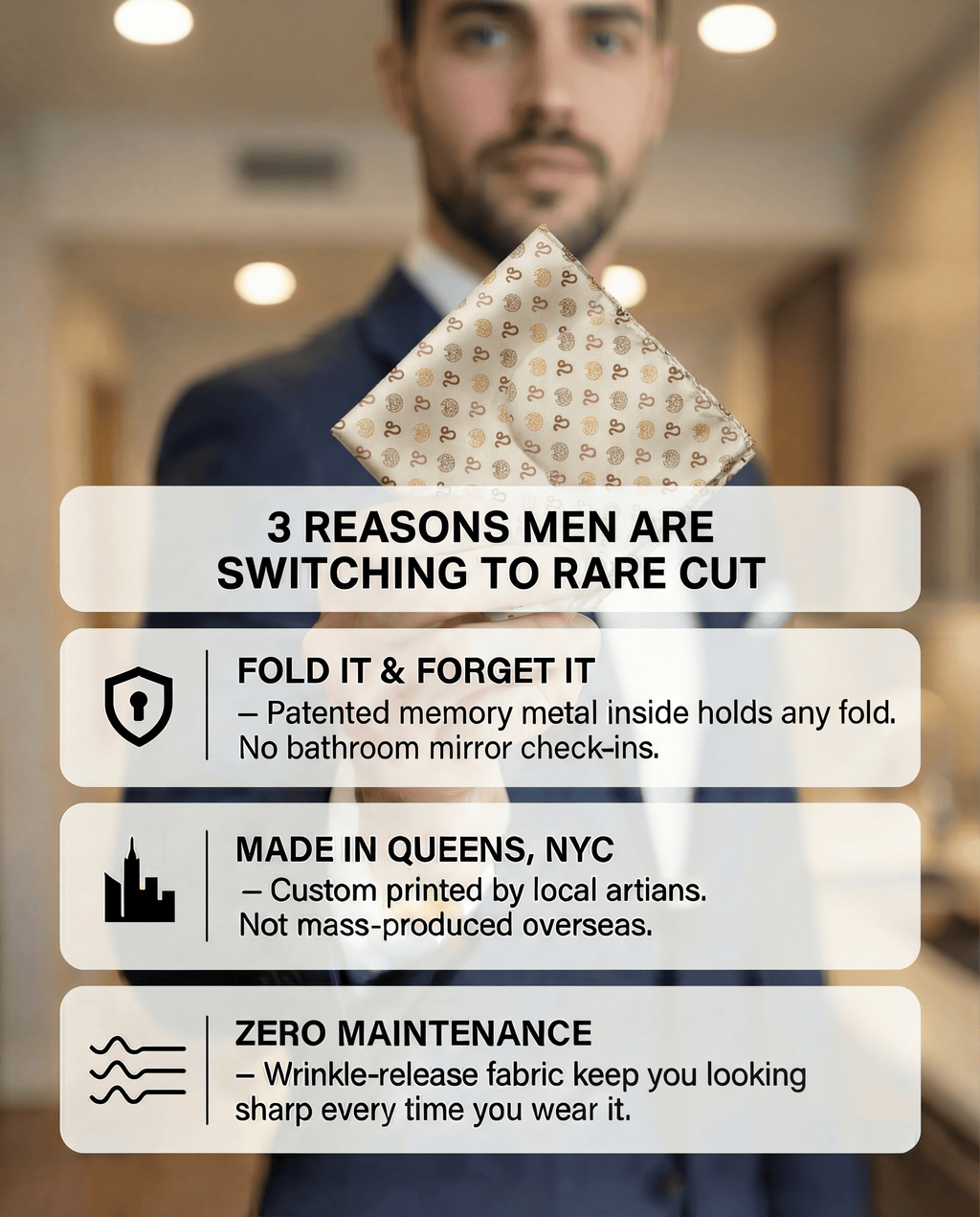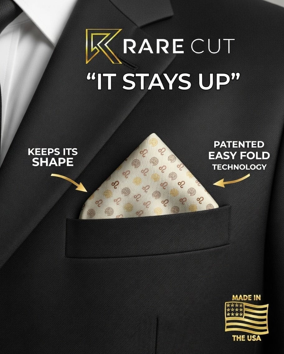 Capture your fold in seconds, and secure it in place all day with a custom printed RARE CUT pocket square in our limited edition "Leo" print.