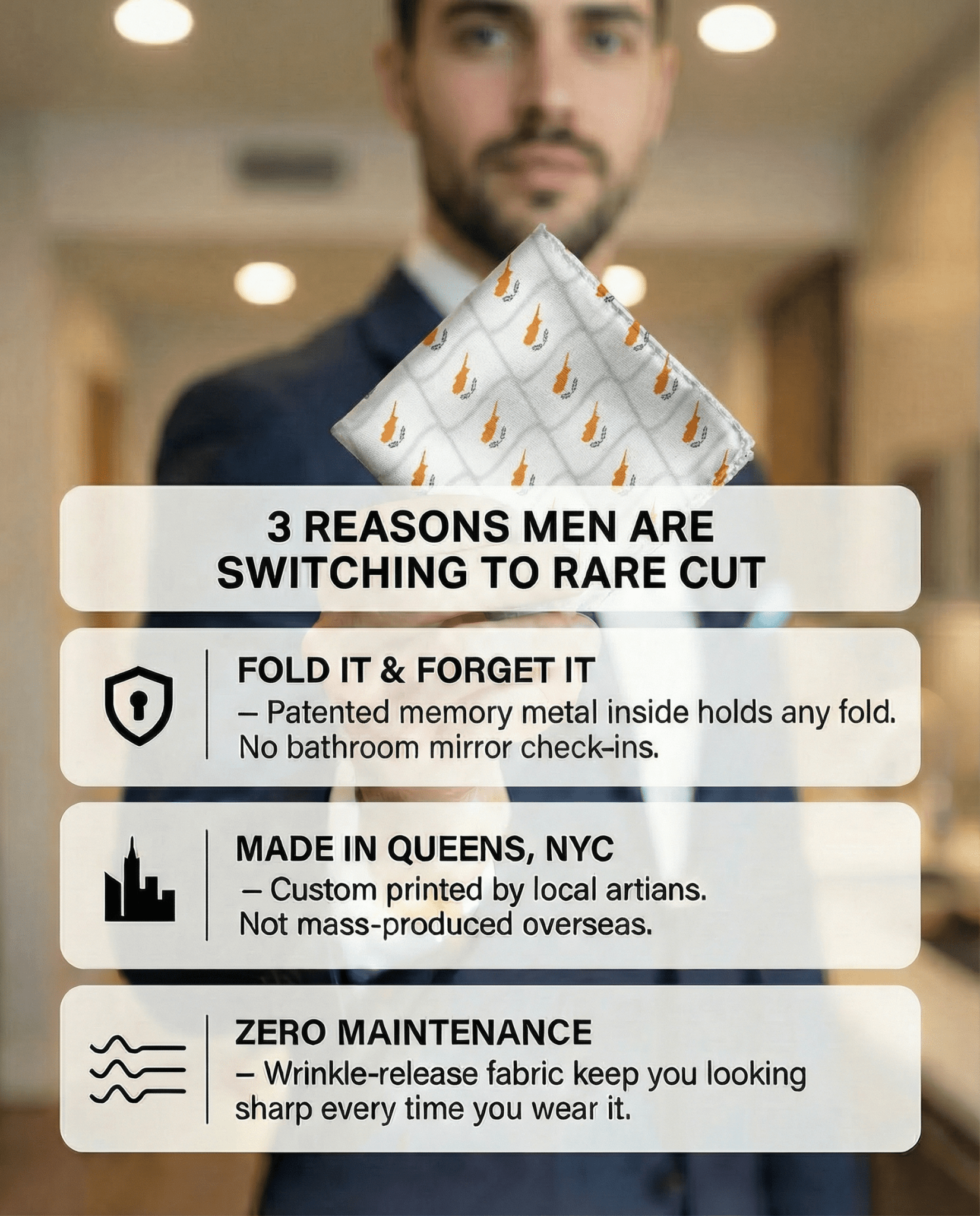 Traditional pocket squares rely on luck to stay in place. RARE CUT uses a proprietary, paper-thin memory-metal lining that allows you to shape your square once and forget about it. It’s the first major innovation in men’s formalwear in a century—designed to keep you looking sharp from the first toast to the final dance.
