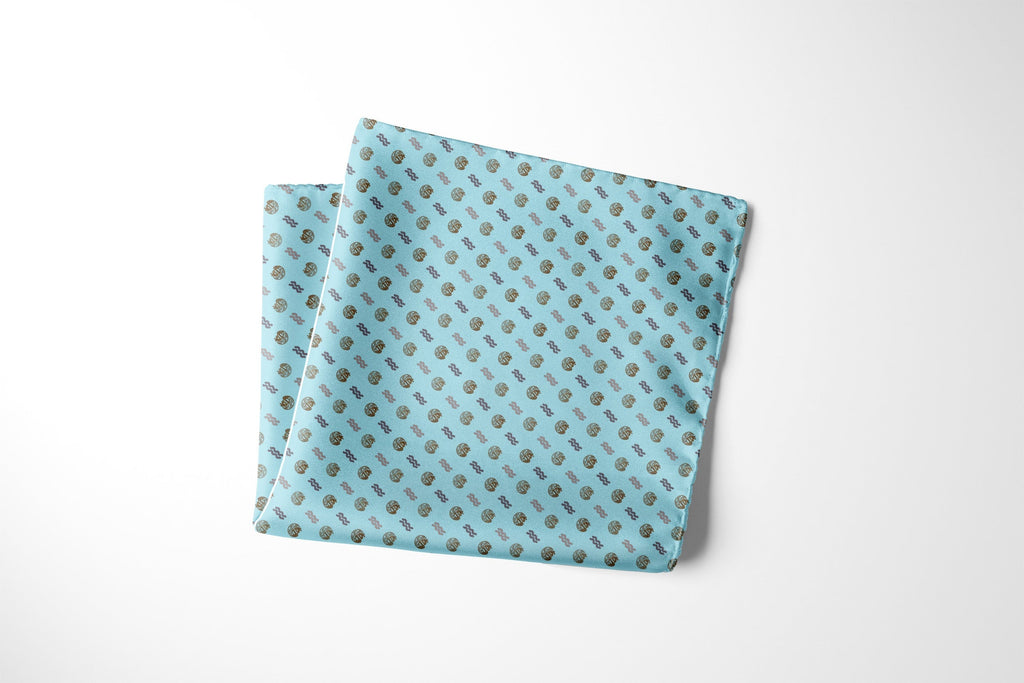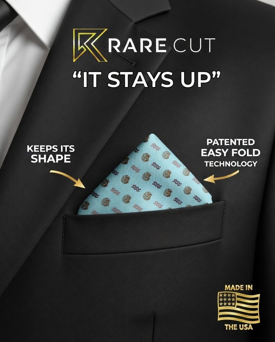 Capture your fold in seconds, and secure it in place all day with a custom printed RARE CUT pocket square in our limited edition "Aquarius" print.