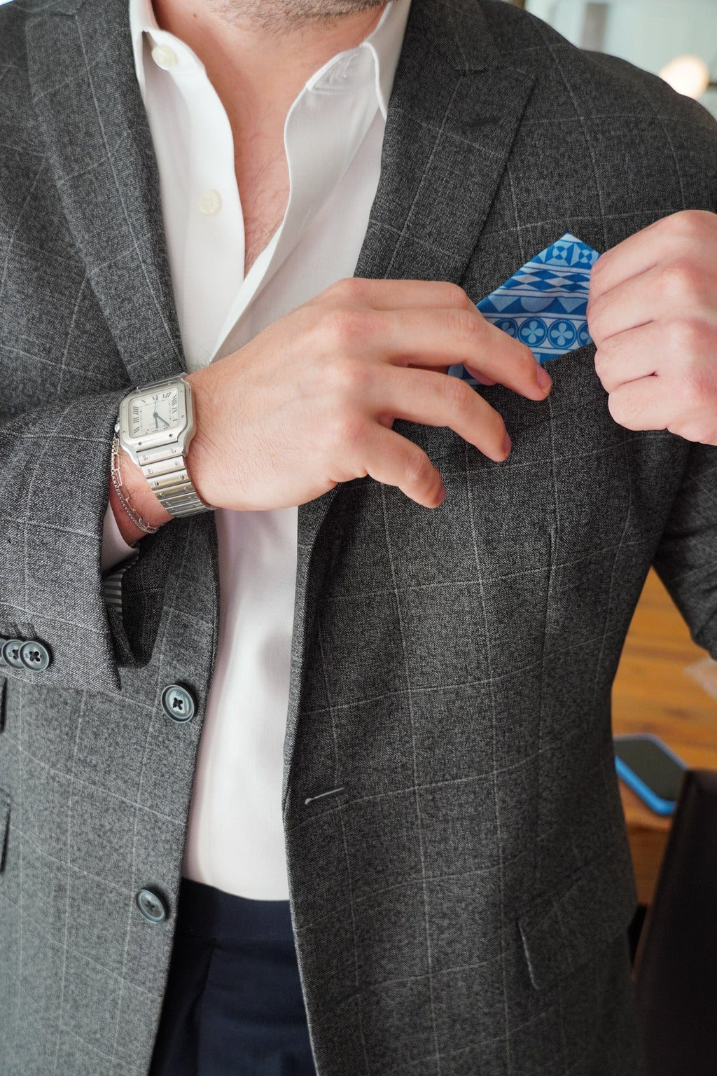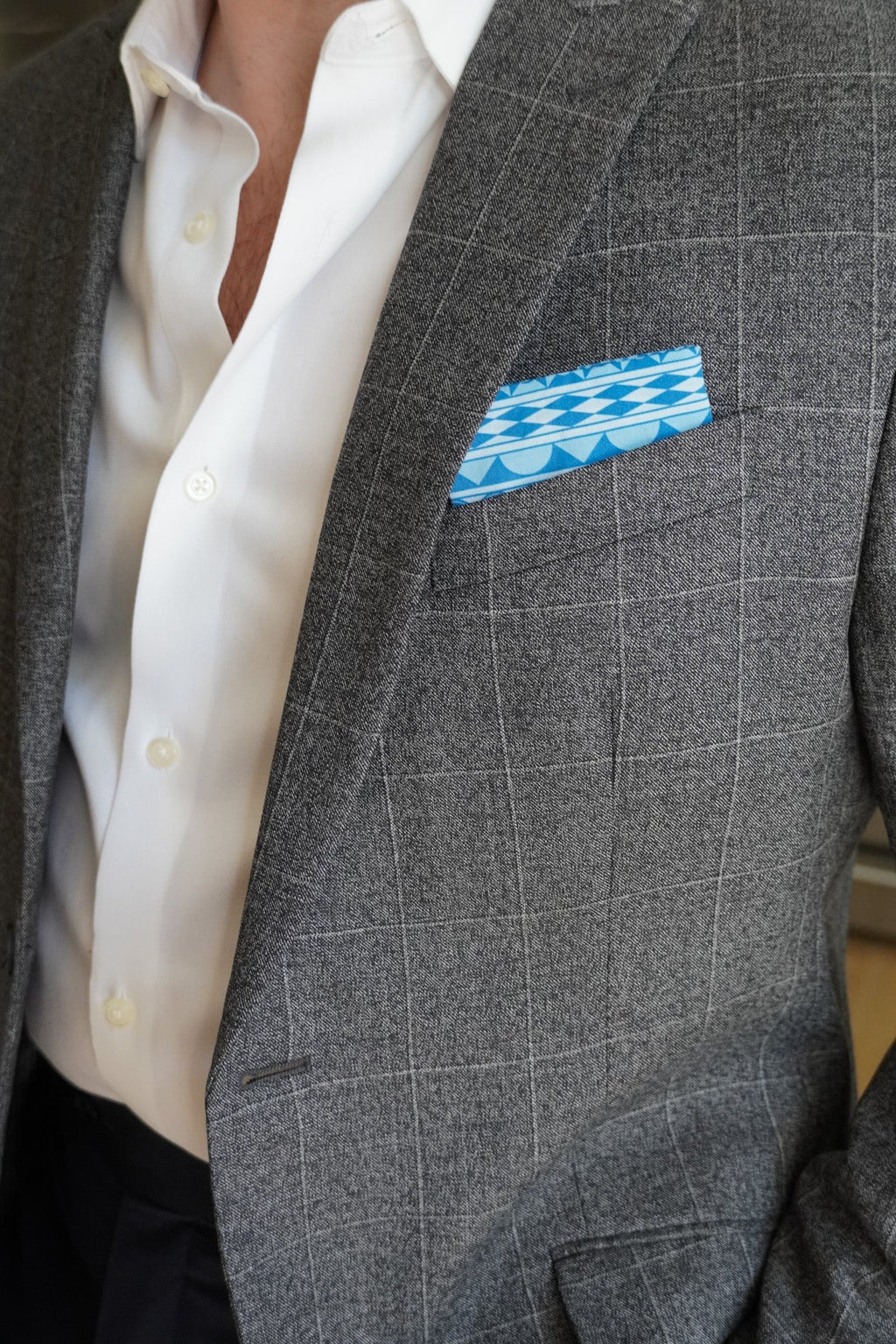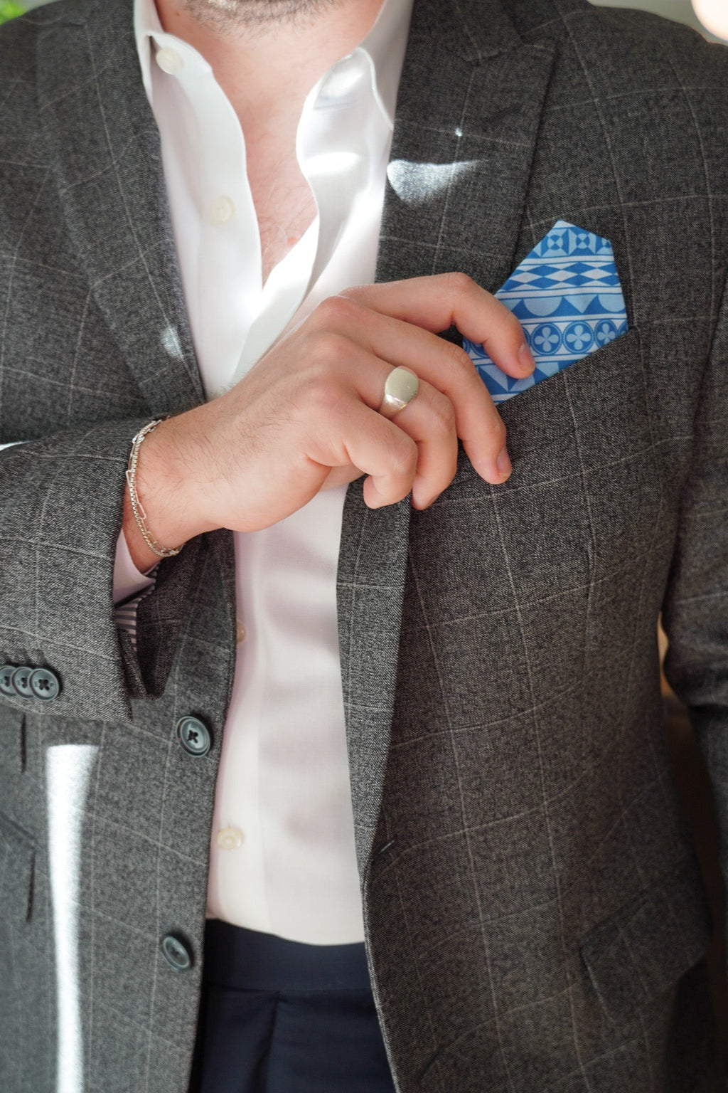 Our collaboration with Selini Shop. The Pyrgi pocket square draws inspiration from the intricate patterns of Chios' famed village. A modern homage to Greek craftsmanship and architectural beauty.