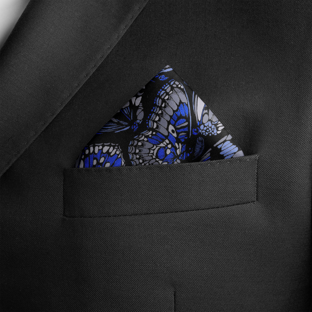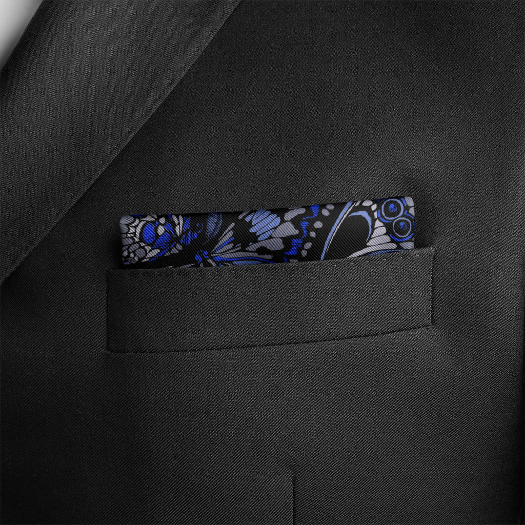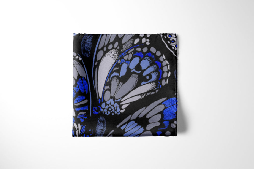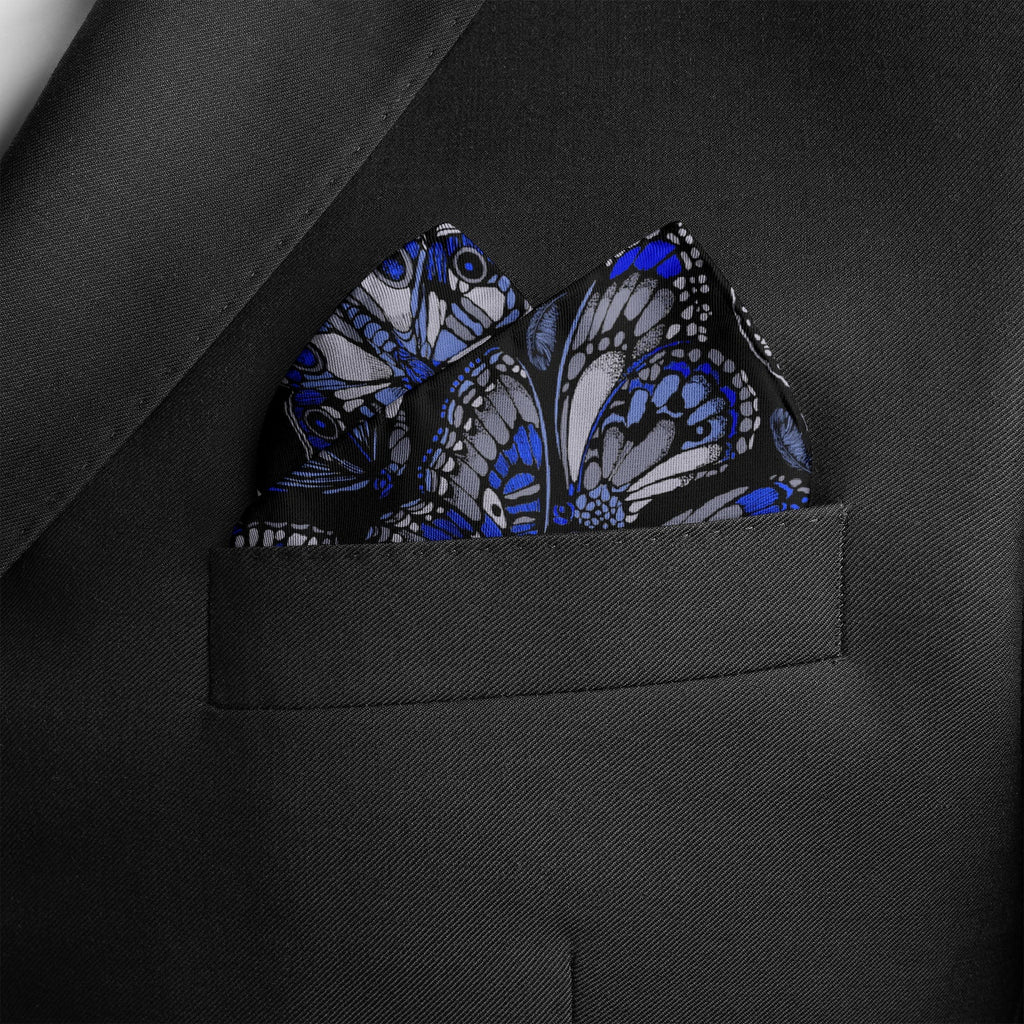 Capture your fold in seconds, and secure it in place all day with a custom printed RARE CUT pocket square in our limited edition "The Butterfly Effect" print.